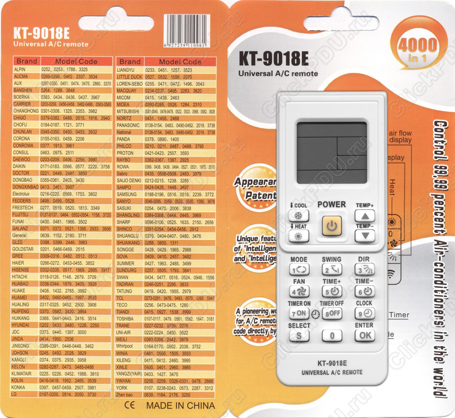 Универсальный пульт дистанционного управления QUNDA КТ-9018Е предназначен для управления более 4000 моделей кондиционеров различных производителей. Поддерживает все известные модели кондиционеров китайского производства, а также модели всемирно известных производителей.