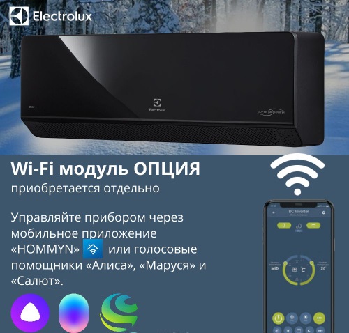Возможность управления через приложение Hommyn с помощью Wi-Fi (модуль докупается отдельно от кондиционера) позволит контролировать температуру в доме дистанционно. Hommyn работает с голосовыми помощниками Марусей и Алисой.